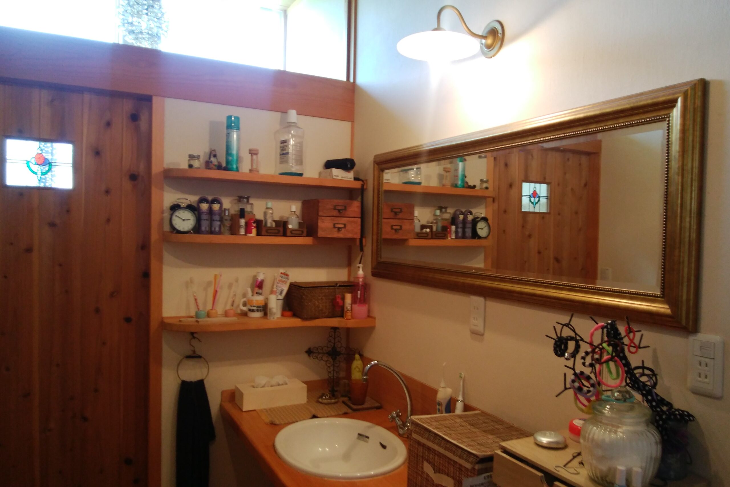 洗面脱衣室にある大きな鏡も買ってきたものを見せてお願いしたら、担当の大工さんが付けてくれました。